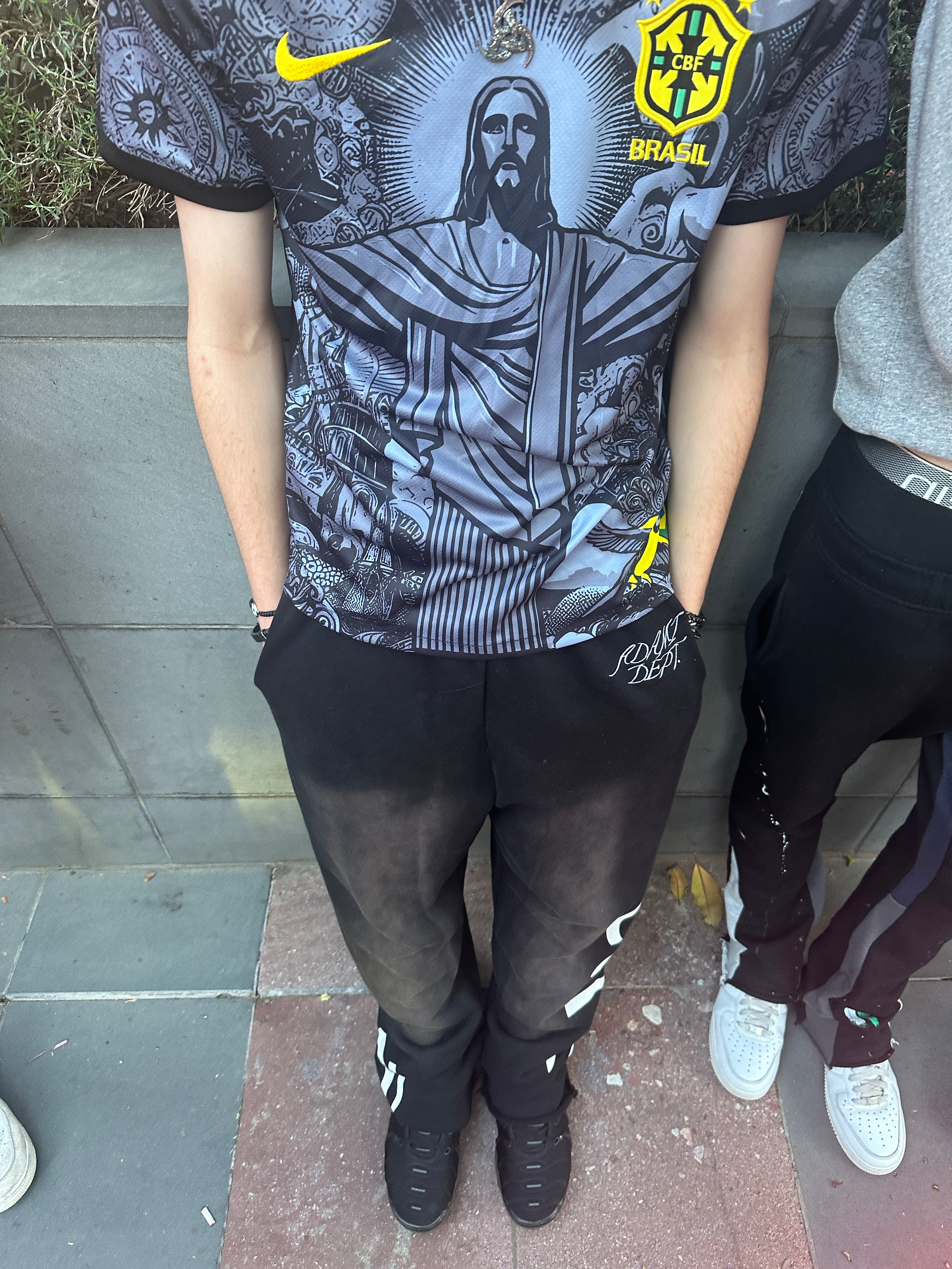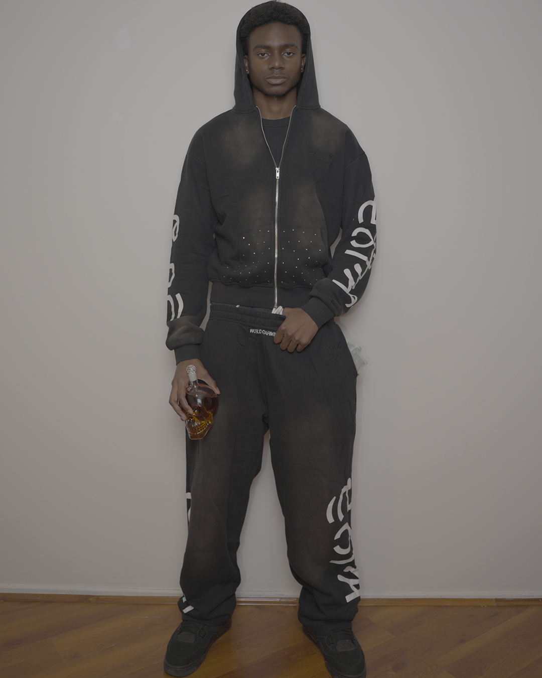 100% Cotton, 450 GSM (heavy asf). Screen-printed, embroidered, fabric appliqué. Distressed, washed.
